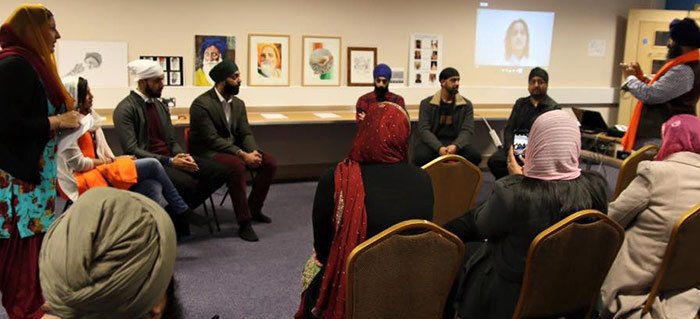 A panel of artists including ‘Sumanjit Kaur Johal (SUM), Jasdeep Samra, Jyoti Dhanjal (J.S. Dhanjal Art), Prabhjot Singh (Prabolous), Harjinder Singh (Infamous Arts) and Rajinder Tattal (Pentacularartist) who all took part in a Q & A with the audience. They gave insights into the concept behind their art works, the challenges artists face and offered useful advice to emerging Sikh artists.