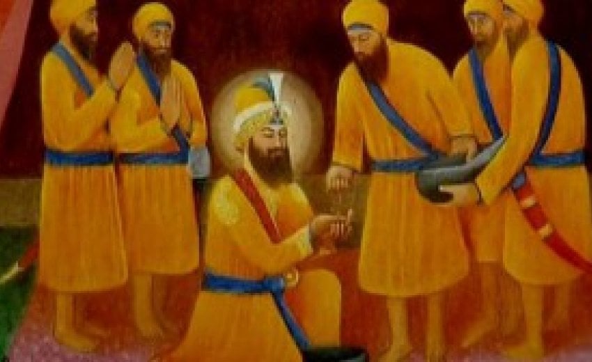 On the Sangrand of Vaisakh 1755 (30 March, 1699 A.D.) at Anandpur in the congregation of around 5,000 devotees, Guru Gobind Singh came out on the dais with a naked sword and demanded for a Sikh to offer himself for sacrifice. It caused deadening silence among the people and a fear gripped many. It was Daya Ram Sobti Khatri who came out to offer himself for the sacrifice. He showed no fear of death at the hands of the Guru as he himself had totally committed to the Guru and his ideals. As he led, four more Sikhs, Muhkam Chand of Dwarka, tailor by trade, Sahib Chand of Bidar Karnatak, barber by trade, Dharam Chand of Hastinapur Utter Pradesh and a farmer by trade and Himmat Chand of Jagannath Orissa, water carrier by trade followed and offered themselves for the sacrifice one after the other.