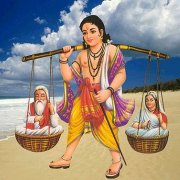 Sarvan made a carriage from a solid bamboo stick and hung two baskets either side with ropes. In one basket he sat his mother and on the other side he sat his father. Day and night he would carry his blind, old parents on his shoulder.