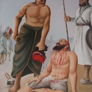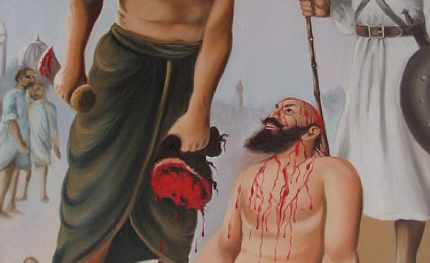 But it is not that easy to separate the skin from the skull, and one has to be very callous to do such a thing. Bhāī Tārū Jī‘s heart started beating furiously with the pain, and his blood seeped from the ever-enlarging wound. Now and then his consciousness became dim and it seemed that to him that his soul and his body wanted to separate from one another, but time would not stand still for him and kept bringing him back to the brutal reality he was in. While he was conscious, he recited from the Gurbāṇī and chanted VĀHIGURŪ VĀHIGURŪ VĀHIGURŪ. Suddenly a terrible sensation of something being ripped apart ran through his body in incessant waves. The whole skin of his head had been pulled off. An open wound was exposed to the air like blazing poppy in the light of the setting sun, pulsing and pounding with pain, and pity asked love "Shall we release him for a moment?", and his consciousness faded away.