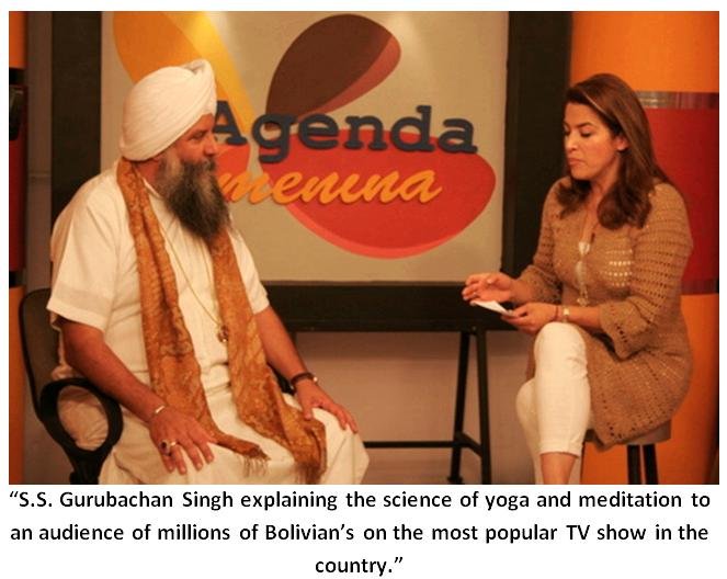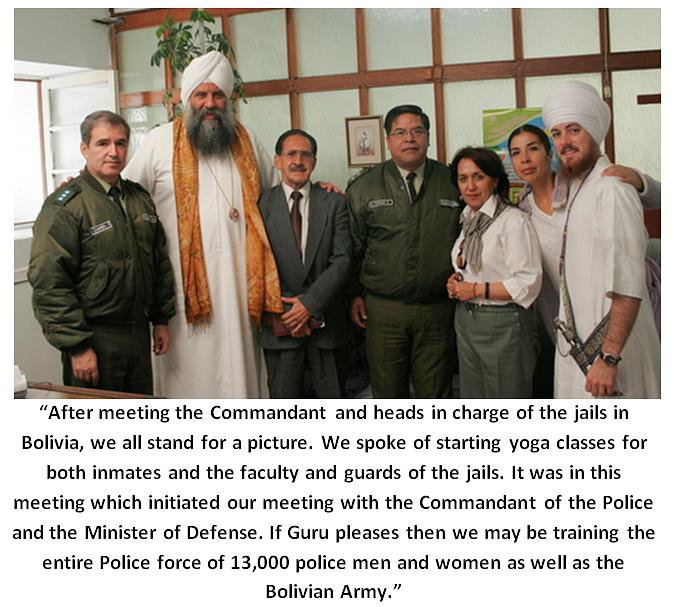 Perhaps the greatest gift this tour gave us in Bolivia was a meeting with the Governor of all the prisons where we presented offering Kundalini Yoga to the prisons for the prisoners and prison guards. The Governor immediately accepted our proposal and the classes started in November. During the meeting, S.S. Gurubachan Singh noticed that the National Bolivian Police are in charge of the prisons and proceeded to mention to the Governor that for the past 5 years we have been teaching yoga and meditation to the National Police of Colombia. Immediately the Governor called the Commandant General who is in charge of all 13,000 police in Bolivia to meet with us about this program. Within one hour we met the Commandant General in his office. Now the National Bolivian Police will be learning the science of breath control through meditation as well as all the other aspects of Kundalini Yoga. On top of this wonderful news, while we were in the meeting with the Commandant General, S.S. Gurubachan Singh received a call from the Minister of Defense of the Government of Bolivia to discuss teaching the Bolivian Army and defense forces how to meditate and do Kundalini Yoga. This unique and overwhelming opportunity is a gift from Guru Ram Das. Imagine the impact this will have on the world!