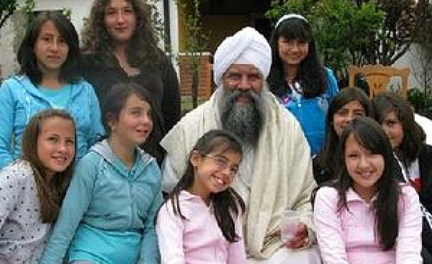 S.S. Gurubachan Singh poses with a group of young Bolivian girls who practice yoga and meditation as an extracurricular activity.