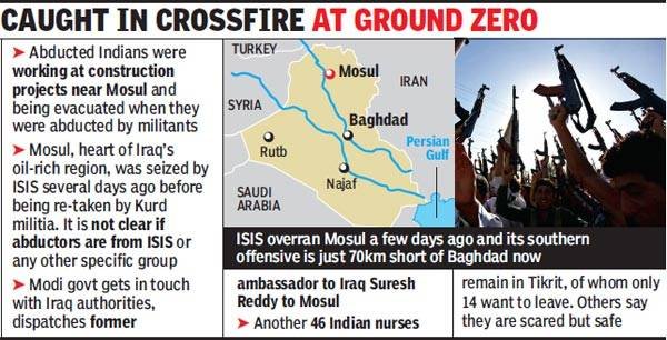 "Around 40 Indians working on projects near the Iraqi city of Mosul were kidnapped by suspected ISIS militants when they were being evacuated from the area ravaged by the war between the Shia-dominated government in Baghdad and Sunni jihadis," the report said. (Click here for the news story.)