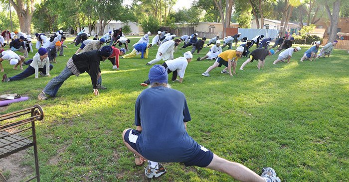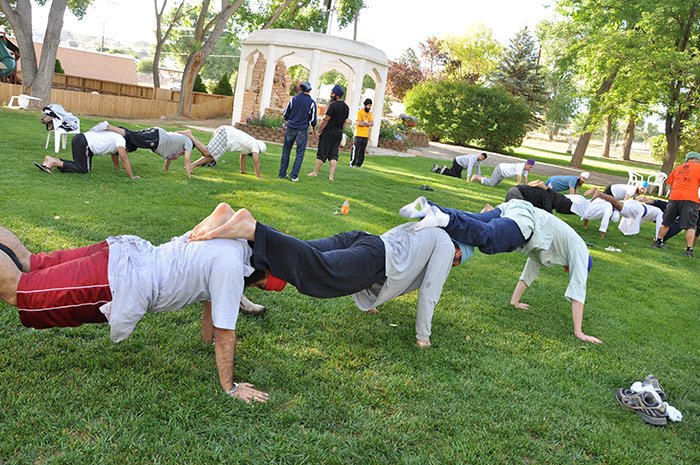 Gurutej Singh Khalsa is a poet, warrior, scholar, author, meditator and a senior teacher for camp Miri Piri. Below he is leading the group in stretching exercises. Above is one of the more difficult, but still fun, physical work outs lead by Gurutej Singh. A good way to start the day!