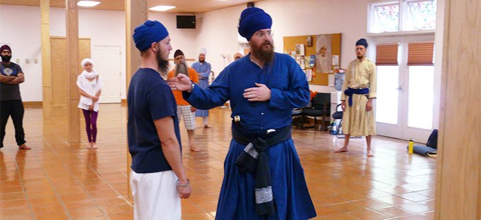 Below is an image of Sada Sat Simran Singh Khalsa from the Chardi Kala Jatha leading a class in hand to hand self defense.