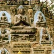 This is the "pilgrimage season" in Bodhgaya. Under the Bodhi tree where the Buddha achieved enlightenment, on the west side of the Mahabodhi temple, a stream of people passes in silent contemplation. The great temple they are circumambulating dates from the Gupta dynasty (fifth to sixth century), the golden age of India, whose art and architecture it splendidly embodies. The setting is a large mandala-garden, laid out around the 150-foot tall tower, which has four smaller towers in the same style.