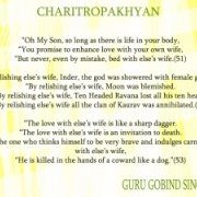 The content of Charitropakhyan is not “ashleel” as described by some. The details about a woman’s beauty and form wherever described in Charitropakhyan are there to explain about the twisted deceitful plan of action indented by her in all the tales. Also as claimed by some, Charitropakhyan is not an attack on women. I think every woman should read Charitropakhyan and I assure all the Sikh women that you will not at all feel offended because Guru Gobind Singh Ji is not criticizing women. Once a woman has read Charitropakhyan in all its totality only then she can come to her conclusions about the main idea and teaching that this composition intends. In it she will find help, a guide, an eye opener, for the good men in her life, not to get entrapped in this kaamic pitfall.