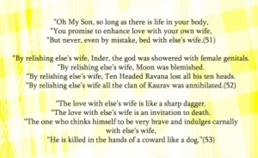 If anyone finds these Charitars sexual it is because of two reasons, one he is not reading the whole chapter and just stopping because some of his hidden kaamic fantasies are popping up in his mind, or second he totally refused to see the tamasha of kaamic maya around him and failed to realize that our Great Guru did a great favor to his Sikhs by trying to protect them from all the deceitful sexual treacheries of women. There is no reason for any good man or woman to feel offended by it or feel sexually aroused by it. It is a dirty pile of all of our own fantasies gathered from the kaamic mud round us which is the cause of that. Our Guru is trying to give us his hand to pull us out of this kaamic quagmire.