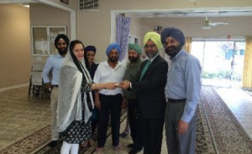 | Paramjit Kaur, Secretary of Illinois Sikh Community Center Gurdwara handing a check to Dr. Rajwant Singh and Sarwan Singh of National Sikh Campaign |