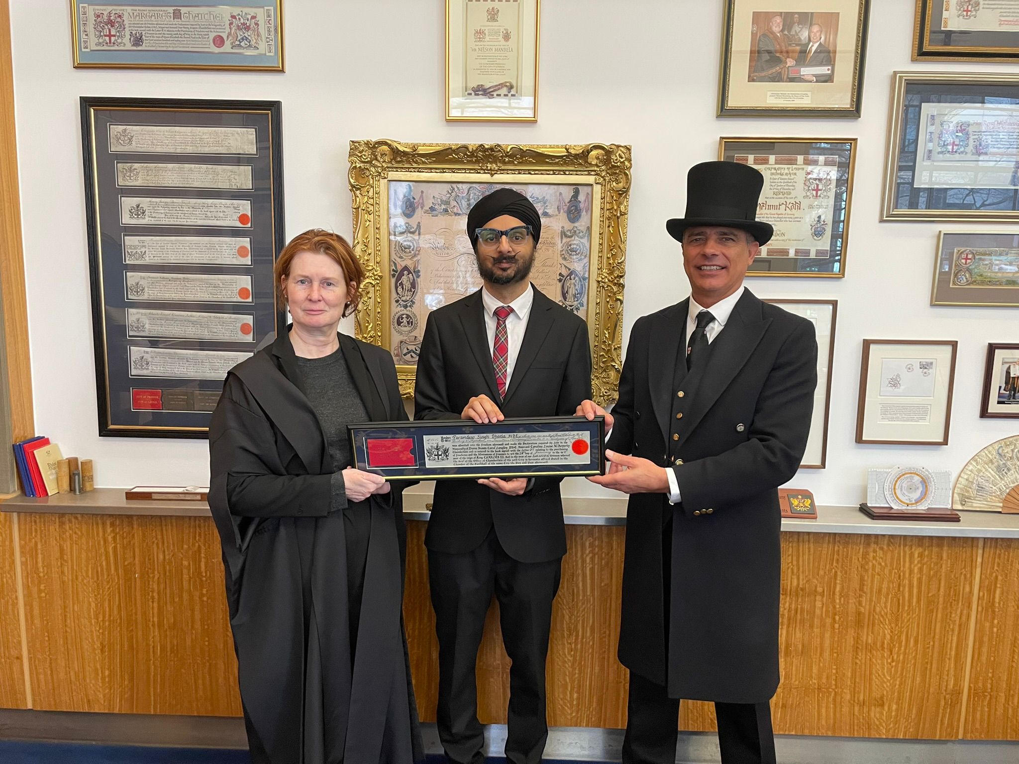 Param Singh MBE with Laura Miller, Clerk to the Chamberlain’s Court, and Beadle Theo Loizou at Guildhall.