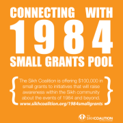Thirty years later, it is critical that we connect with recent history and empower Sikhs to create a better future for the community. The Sikh Coalition is announcing the "Connecting with 1984" Small Grants Pool to support and encourage community activism. A group of generous and committed donors have come together to offer $100,000 in small grants to individuals and/or groups who would like to create and deliver educational programs and initiatives to raise awareness within the Sikh community about the events of 1984 and beyond.
