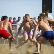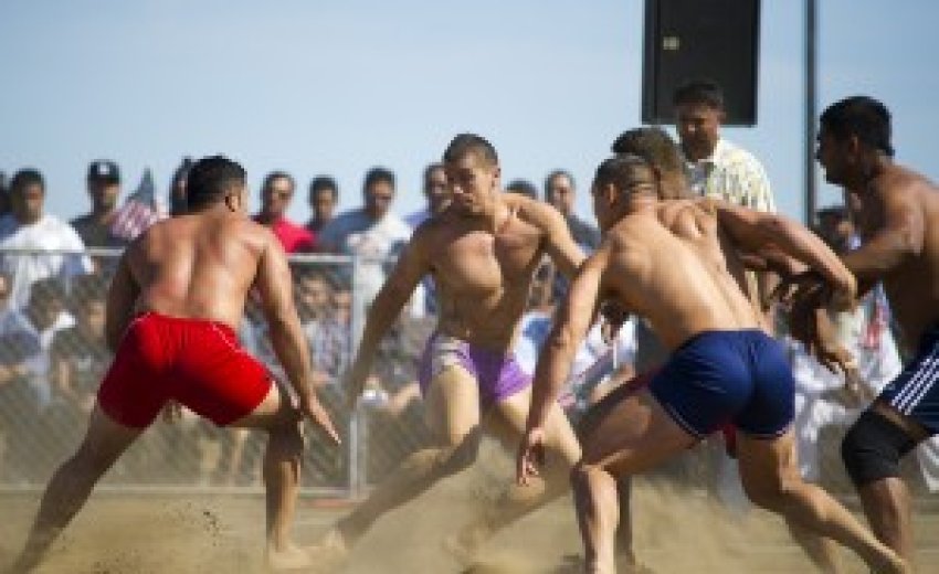 The matches, called Kabaddi, feature a wrestler from one team challenging four wrestlers from the opposing team. The single wrestler chooses one of his opponents, and the two of them go at it on the dirt.