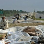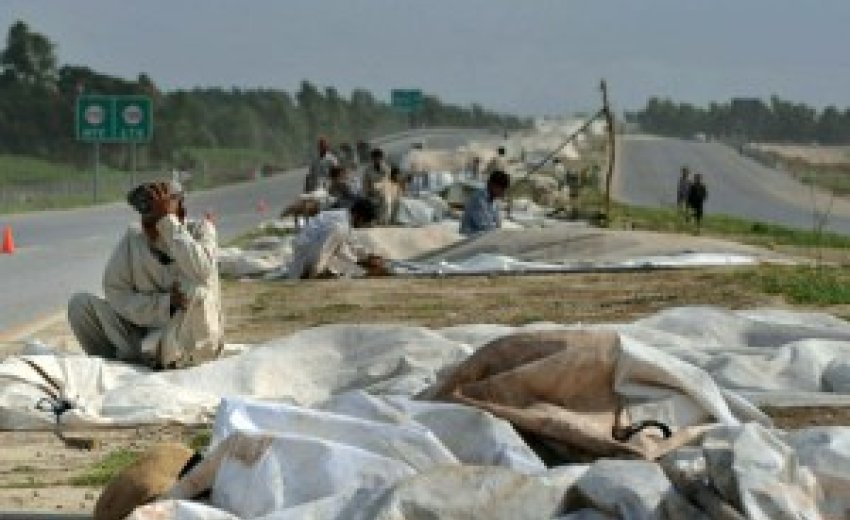 | Pakistanis prepare to pitch tents along the highway on the outskirts of Peshawar. |