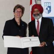 A picture (right) of Dr. Baljit Singh receiving the award/fellowship from Dr. Linda Rabeneck, President of Canadian Academy of Health Sciences.