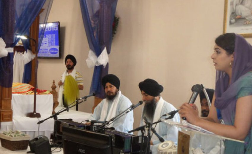 Lavleen Kaur Samra addressing the Sikh Satsang congregation to provide advice on health screenings, healthy diet and living.