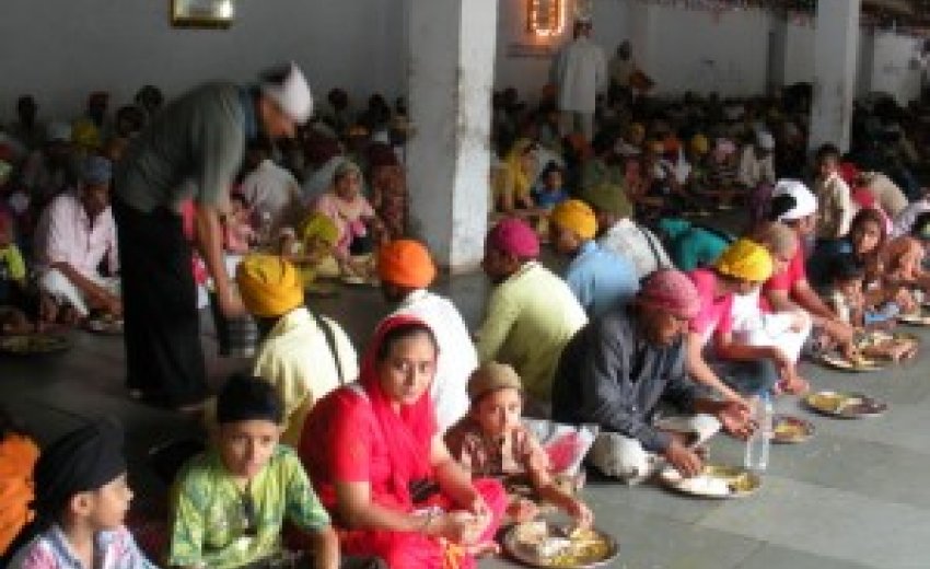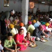 Bangla Sahib Gurdwara : People of all ages, religions and social backgrounds sit together on the floor to take a free meal.