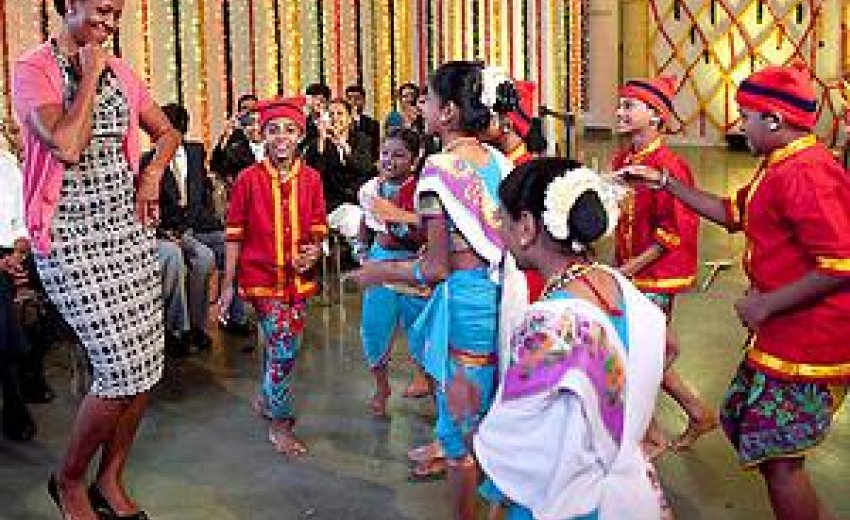 On Saturday, Mrs. Obama met with 33 orphaned and runaway children who are being taught English by Make a Difference, a nonprofit group. She played hopscotch and word games, and then picked up a tambourine and danced with the children to a theme song from a Bollywood movie.
