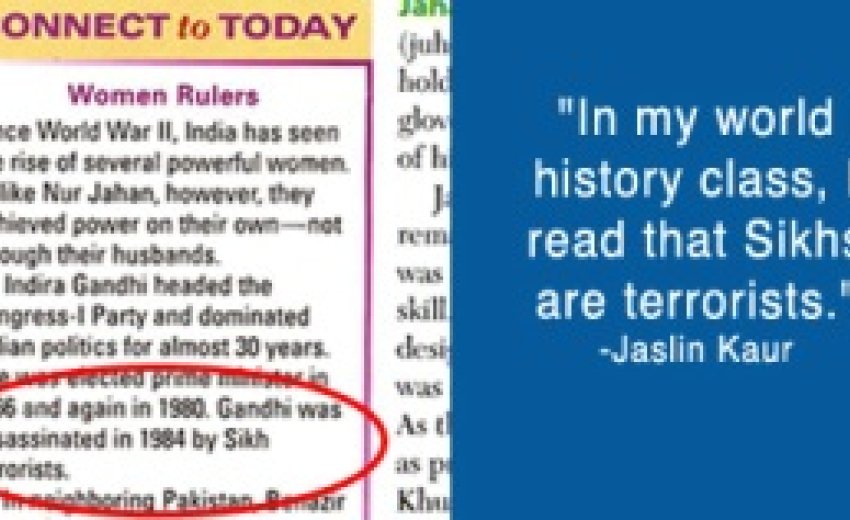 sikhs_textbook2 (75K)Harmeet Kaur is an active sevadaar who lives in Houston, TX. When she received the Sikh Coalition’s request to find textbooks that mention Sikhs, she immediately called her two brothers, and asked them for their social studies textbooks. Then, she looked through the books for any mention of Sikhs or Sikhism. In her brother’s world geography book, she found that it said, "Gobind Singh also introduced the practice of men wearing turbans on their head, and never cutting their beards or hair." The book does not mention that Sikh women also do not cut their hair. In her other brother’s world history book, she read that Sikhism was a Hindu sect. She immediately visited the Sikh Coalition’s “Throw the ‘book’ at Textbook Publishers” campaign page, and filled out the online form.