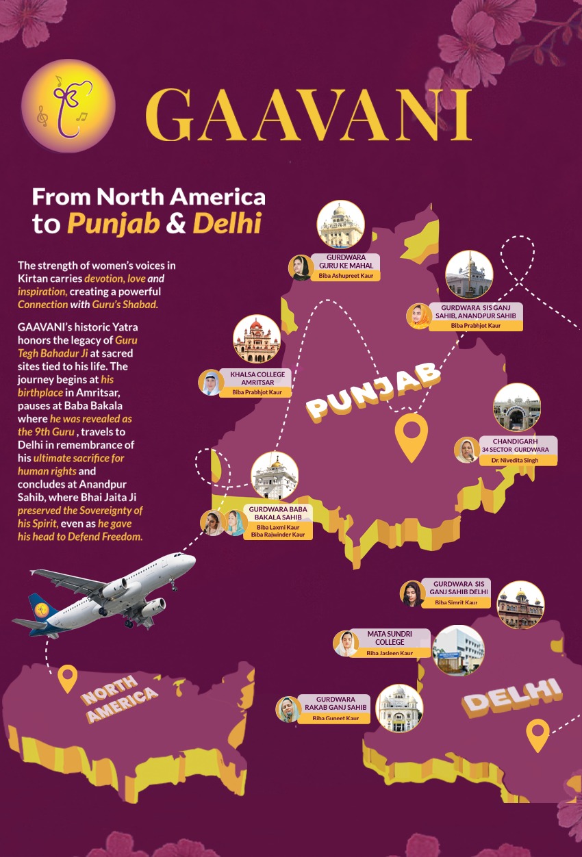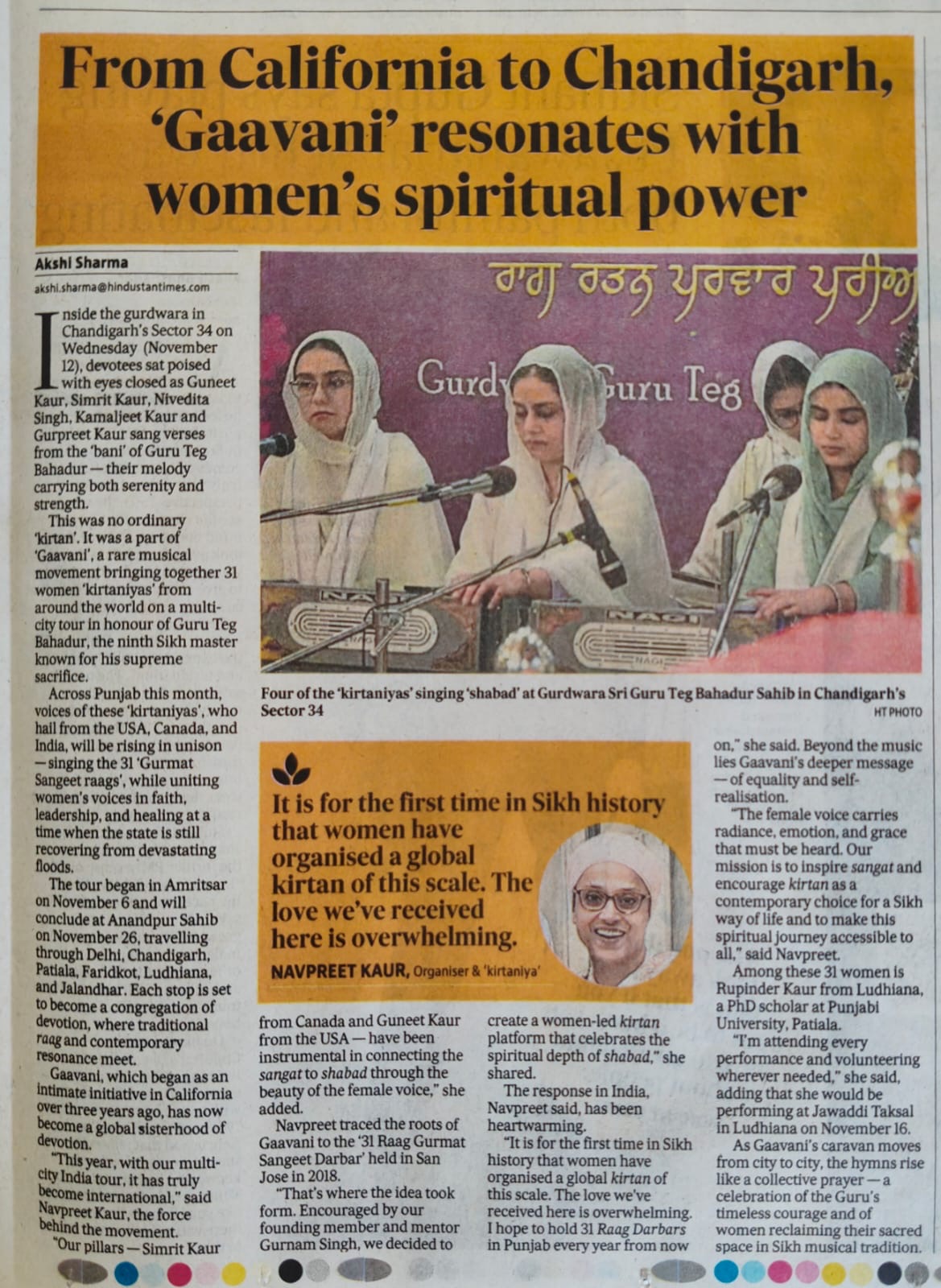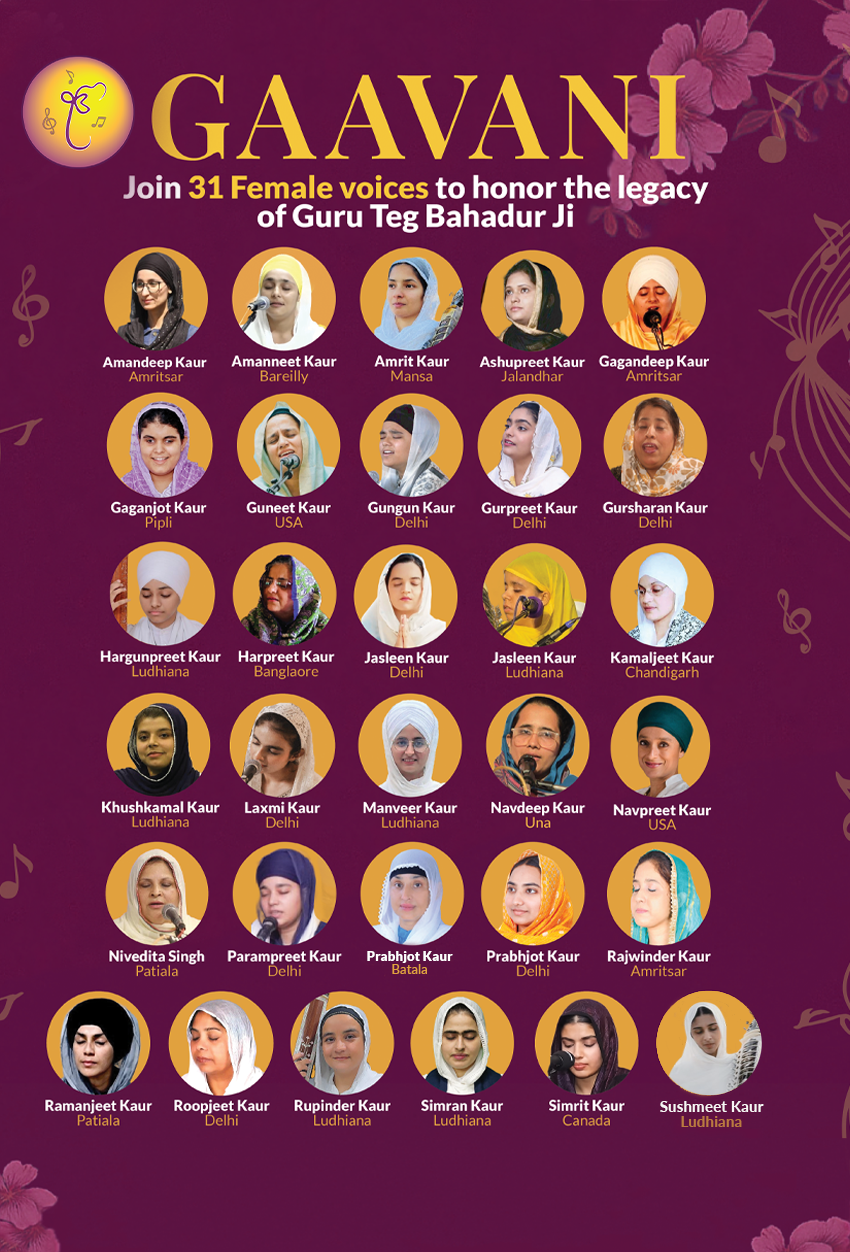 In commemoration of the martyrdom of Ninth Guru Teg Bahadar, GAAVANI visited Gurdwaras and colleges across nine cities in India during November of 2025, in a landmark, first of its kind, history making, Kirtan tour, and included, altogether, 31 women Kirtaniye singing in 31 raags: