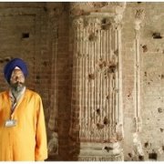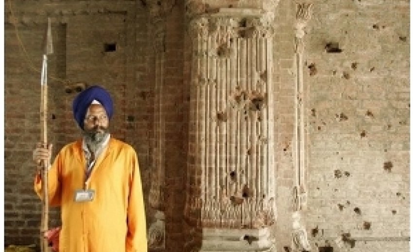 | 84 Ghallughara A Sikh security guard stands before a wall with the bullet marks inside the complex of the Golden Temple, Sikh's holiest shrine, in 1984 |