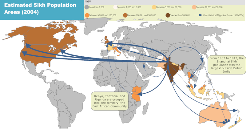 The Sikhs have been spreading all over the world since the beginning of the 19th century. The numbers are somewhat uncertain but they believe there are 23 million Sikhs living in India. There are approximately one and half million Sikhs living in the U.S. and Canada. About 1 million Sikhs in Britain, then we’re spread across Burma, Australia, Kenya, Thailand, Germany, Pakistan, Arab Emirates, France, Netherlands, Spain, Singapore, you name it and we are there. World Sikh Population and Migration - 2004