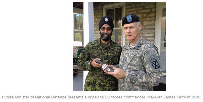 Following Sajjan's second deployment in 2009, U.S. Major-General James Terry, Commander of U.S. forces in Afghanistan’s southern provinces, requested that he join the U.S. Command Team for a third deployment 2010, where he served as Special Assistant to General Terry. Pictured below, Sajjan presented General Terry with a Sikh ceremonial kirpan.