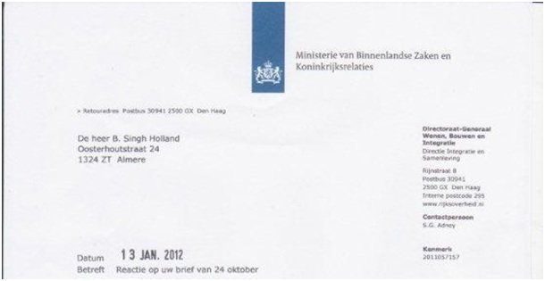 [Pursuant to the relentless efforts of Sardar. Bupinder Singh Holland, Minister of Immigration, Integration and Asylum / The Netherlands, Mr. G.B.M. Leers, responded (English translation) positively as below in his letter dated 13 Jan 2012 ~ ED]