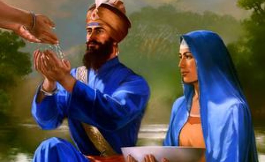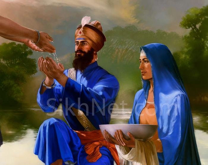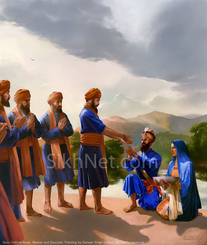 In the scene thus captured, we witness as follows: Having just blessed the First Punj Pyarey with Amrit and transformed them into the first five Khalsa in history, the Guru then positions himself before the Five in bir aasan (the warrior's pose) and asks the Khalsa to bless him with the gift of Amrit as well and initiate him into the Khalsa. With him is Mata Sahib Kaur, holding the sarab loh baata of Amrit.