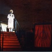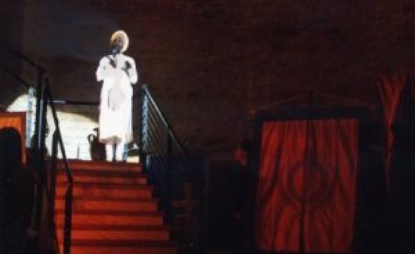 | Rajwant Singh singing Aarti. Organizers had created a scene of Stars in the sky picturing Guru Nanak's hymn. (Sikh Symbol in the background) |