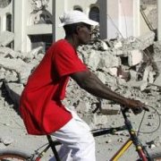 | Haiti: A man cycles past a church in Port-au-Prince damaged by the 2010 earthquake. Photograph: Erika Santelices/AFP/Getty Images |