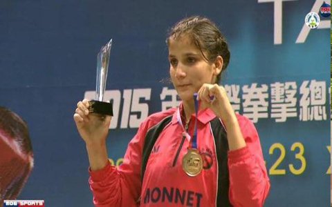 Mandeep Kaur displays her trophy and her gold medal