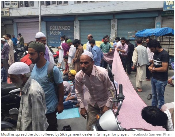 The sizzling temperatures are no deterrent, and the conditions are made easier by noble souls such as an elderly Sikh cloth dealer from Srinagar. As Muslims prepare to pray on pavements outside the crowded mosque in Karan Nagar locality of Srinagar, this Sikh man rolls out new fabric sheets from his shop for them to pray on comfortably. Although he hails from Amritsar in Punjab, he has been living in Srinagar for many years now.