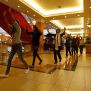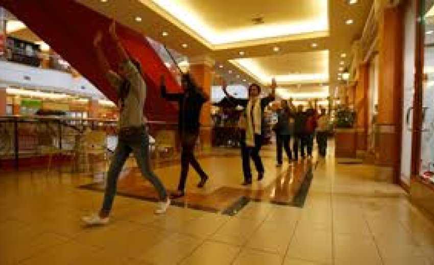 They entered the mall on the top floor and went from shop to shop.