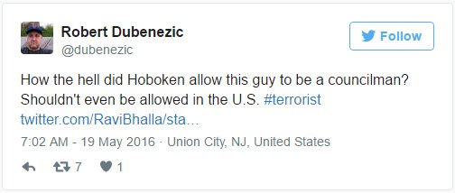 “How the hell did Hoboken even allow this guy to be a councilman? Shouldn’t even be allowed in the U.S. #terrorist,” @dubenezic wrote on the post.
