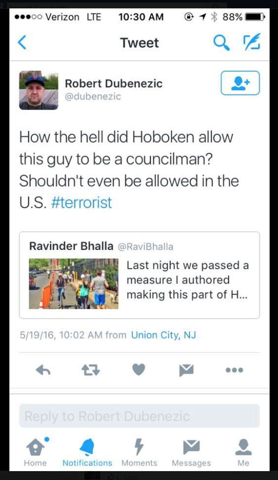 That’s the message that Hoboken City Councilman Ravinder Bhalla gave in reply to a Twitter comment alluding that he was a “terrorist.”