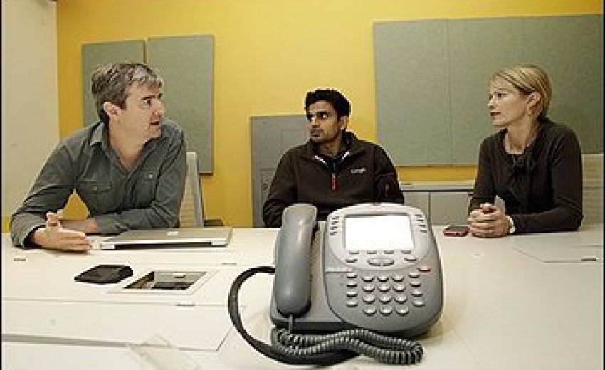 From left, Google employees Steve Crossan, Ujjwal Singh and Twitter Vice-President International Katie Stanton discuss a joint project at Google headquarters in Mountain View , Calif., Thursday, Feb. 3, 2011.(AP Photo/Marcio Jose Sanchez) (Marcio Jose Sanchez - AP)