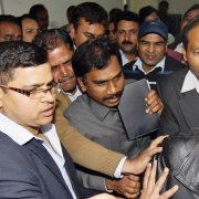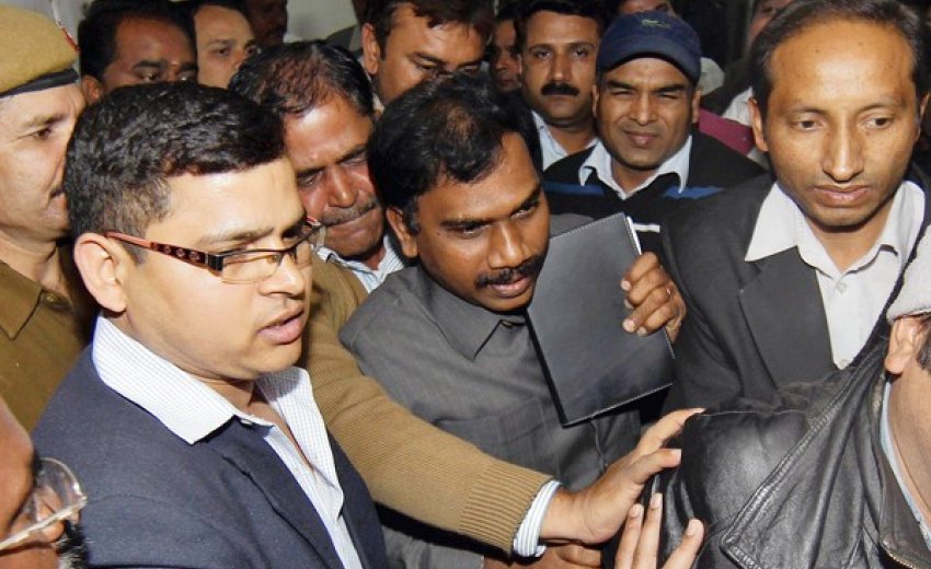 | Former Telecommunications Minister Andimuthu Raja, center, leaves a court in New Delhi after his hearing in connection with a corruption scandal. He is accused of under-pricing mobile broadband licenses, costing the government upto $39 billion. (Adnan Abidi, Reuters / Feb 17, 2011) |