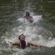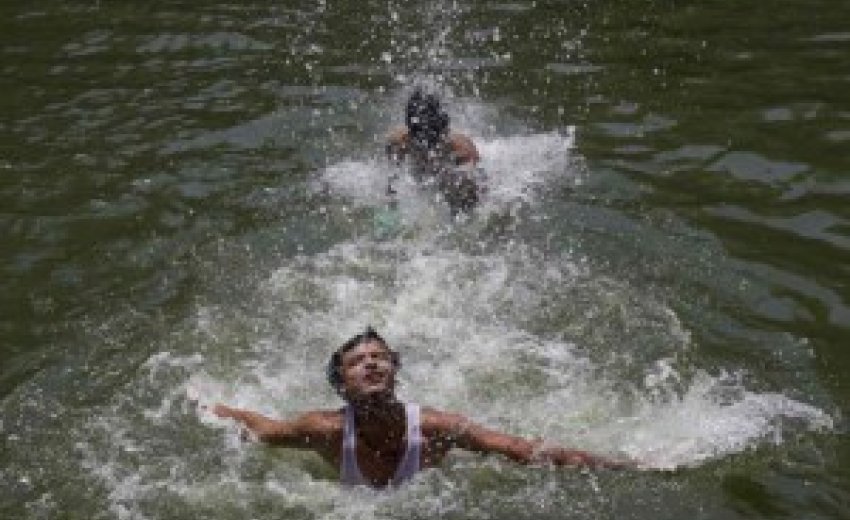 | Boys swimming to cool off as record temperatures of 51C were recorded in the Indian city of Phalodi. Photograph: Tsering Topgyal/AP |