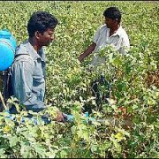 | Thotan Jekan, 37 sprays controversial pesticide Endosulfan on the cotton and vegetable crop in his village. (Rama Lakshmi - Washington Post) |
