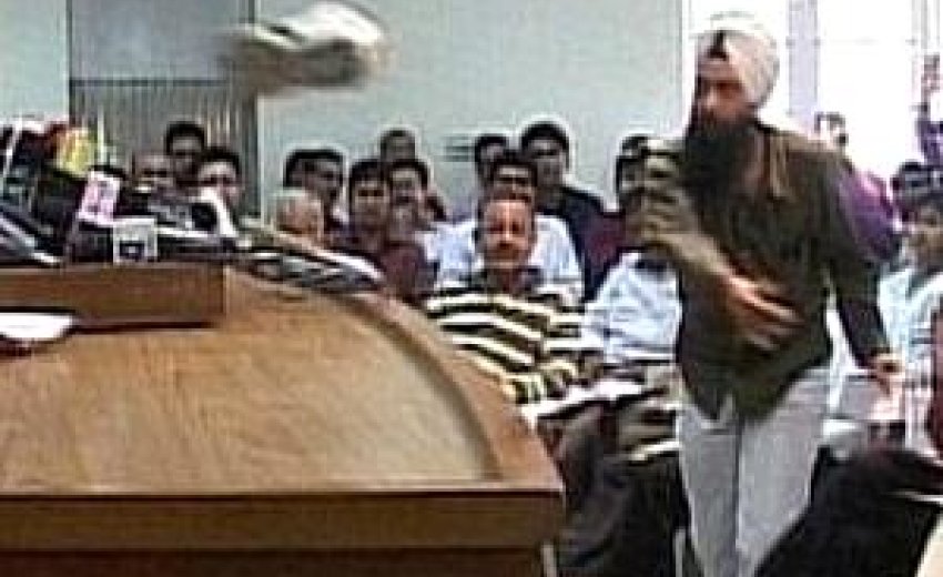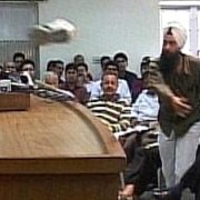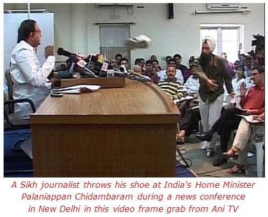 Mr. Singh, dressed in an olive-green shirt and a white turban, then threw his blue and white sneaker at Mr. Chidambaram, narrowly missing his face.