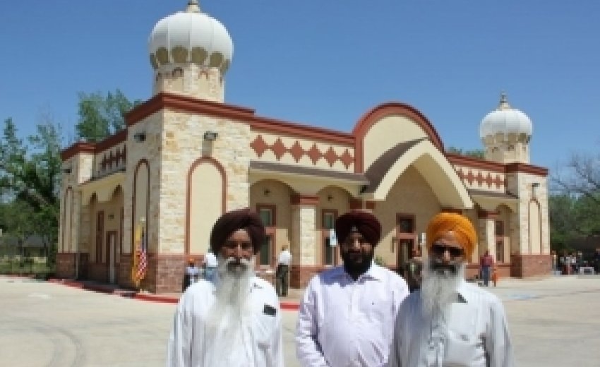 | Sikhs pose for pictures in front of the newly constructed Gurdwara Nishkam Seva in Irving, Texas on April 13 |