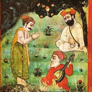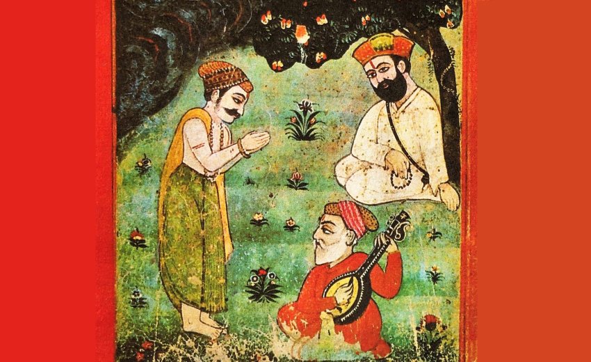 The hands of Guru Nanak are pointing out to God as if they are offering him the rosary of devotion. Looking more attentively at the picture one realises that the weight of Guru Nanak’s body falls on neither of his feet. Inspiration has lifted him up, but his figure is not unstable in the painting. Probably, the falling weight of Guru Nanak’s head makes it balance. The stretched neck has raised his face slightly as if he were concentrating on God only to be dazed by His glory. An impression of the ecstasy of Guru Nanak can be had from the bird in the tree which is looking intently at him. Guru Nanak’s inspiration is affecting Mardana too as he plays his rebec ecstatically.