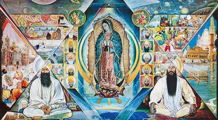 It starts 40 some odd years ago with a renowned Catholic muralist named Edward O'Brien. A devoted soul, he painted several iconic murals in northern New Mexico churches which all included Our Lady Guadalupe. Lady Guadalupe is a symbol for the Divine Feminine principle originating in Mexico that is very popular among Latin American Catholics. She is known to be the symbol of protection. When Ed O'Brien chanced upon the then young Sikh community he felt that the symbol of the Khanda (also known as the Adi Shakti) represented a similar principle of protection. He felt that both symbols are timeless and beyond description but the same in essence.