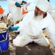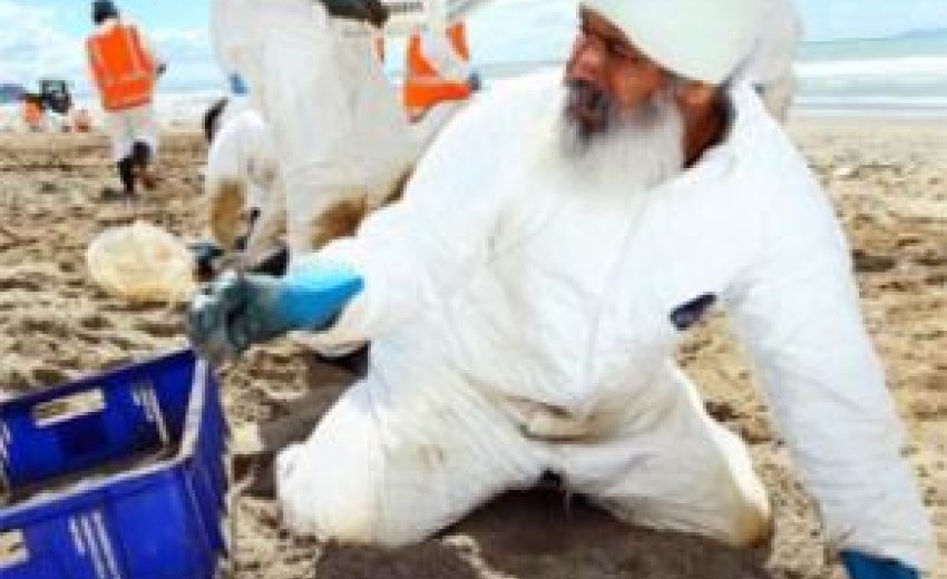 | SIFTING SAND: Sikh Chamkaur Singh, of Tauranga, is among the many volunteers who crawled along Papamoa Beach yesterday, cleaning up the oily mess. |