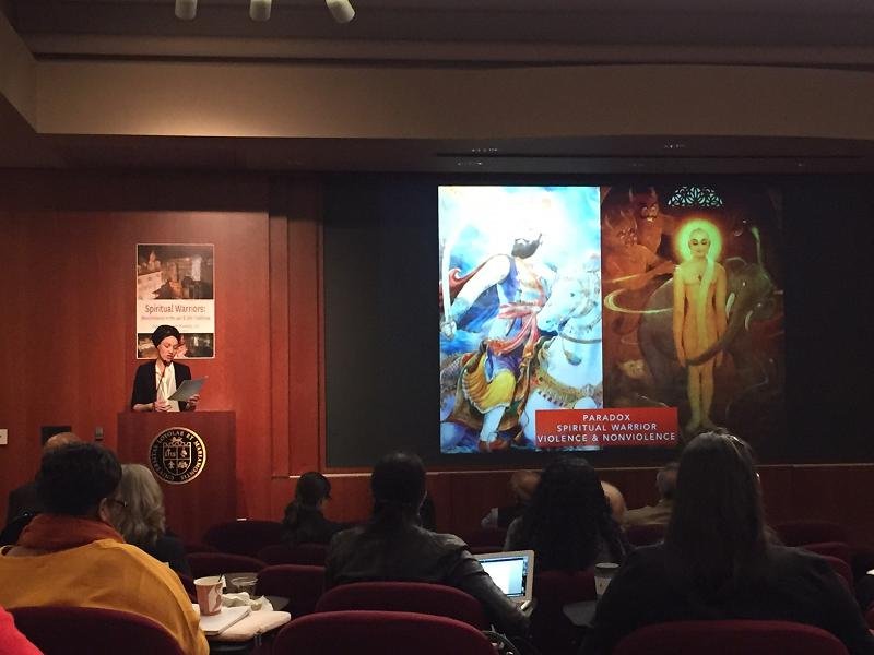 On Friday Feb 24th we had a daylong conference with scholarly lectures. The day began with Professor Nirinjan Kaur Khalsa’s talk “Living as Spiritual Warriors in the Jain and Sikh Traditions” which framed the intention of the conference by exploring how the Sikh and Jain traditions offer tools to live as Spiritual Warriors. While there is a perceived paradox between the Jain pacifist and Sikh warrior traditions; both traditions are grounded in the recognition that violence can start and end with the self through the internal conquering of desires and the passions of ego, hate, anger, fear, etc. Khalsa illustrated how the Sikh and Jain practices offer perspectives and actions to quell the ego and desires, allowing for a “mental ahimsa/non-violence” that recognizes all life as interconnected, and compels us to serve and protect all life in the name of equality, compassion, and justice.