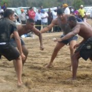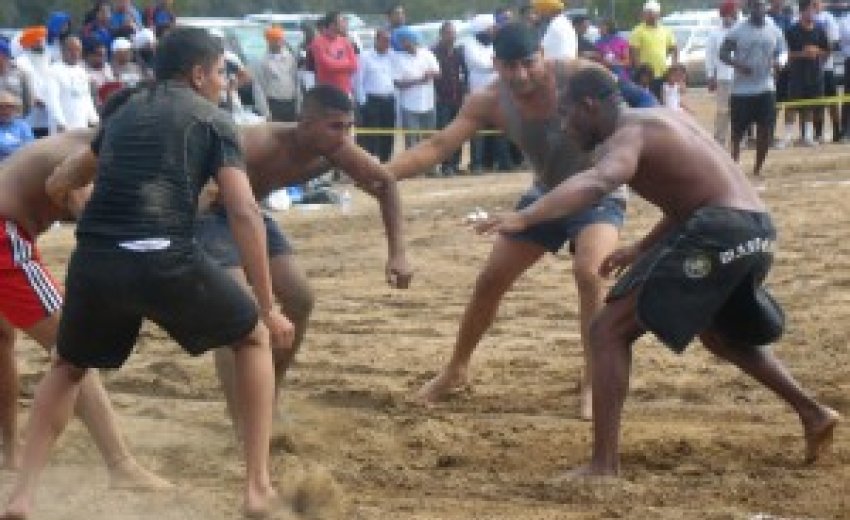 Sikh teams have eight members, but only four of them are on the field at any one time. The four wrestlers on the field hold hands while one of the opponents approaches them and seems to do a series of head fakes before choosing one of his opponents to wrestle. All four have to be ready to be on the receiving end of an attack by an opposing wrestler as they roll in the dirt.