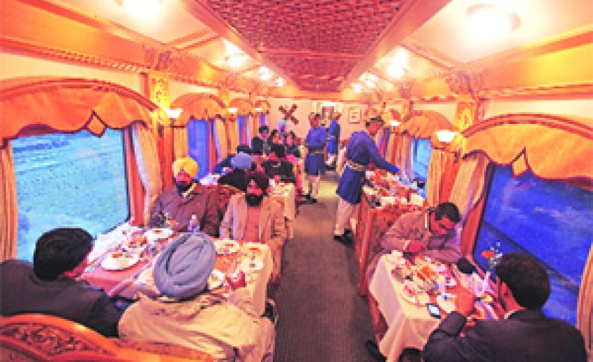 | A restaurant inside the Deccan Odyssey train taking passengers on a Sikh pilgrimage, on its first halt at Anandpur Sahib railway station on Thursday |