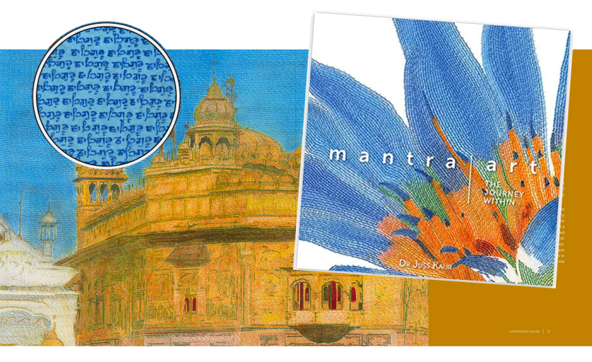 To understand mantra art, one must first ask the question: what is a mantra? This Sanskrit word is derived from two roots: man meaning ‘mind’ or ‘to think’, and tra meaning to ‘protect’, to ‘free from’, or ‘instrument’. A mantra is a tool of the mind used to free itself. Mantra art is a way of driving inwards to the source of creativity, allowing us to get in touch with, and to expand, our true inner selves. Art is not born of us but through us and, with this understanding, we are humbled yet profoundly empowered. For me, Mantra art is a form of meditation and spiritual dialogue. My personal pathway to art truly opened while I was a teacher making sketch drawings to pass the time while my students wrote exams. The Waheguru chant that had been used for meditation at the retreat I had just attended was still reverberating in my head.Instinctively I picked up a pen and started writing the Waheguru mantra within it, which began to flow into a rather lovely pattern. I followed the curves and filled the entire image. When I finally sat back to look at the resulting creation, I felt quitedrawn to it. It reminded me of the particle nature of the universe. All matter can be broken down into increasingly smaller particles, from molecules, to atoms, to electrons and so on. Everything is made of these vibrating particles, this energy. My scientific background was collaborating with the new understanding that suggested that all is part of the One. Sabh gobind hai, sabh gobind hai gobind bin nahi koe