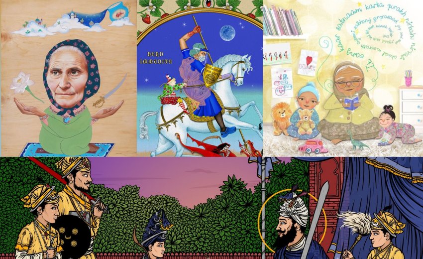 Sikhs are encouraged to care for and protect their family unit and to nurture children for the benefit of creation. People of faith are meant to provide for their children, teach them Sikh values, and share respect and equality. The work of Baljinder Kaur captures the beauty of family life to perfection, with colorful depictions of family members spending time together reading, singing, and taking part in other creative pursuits.