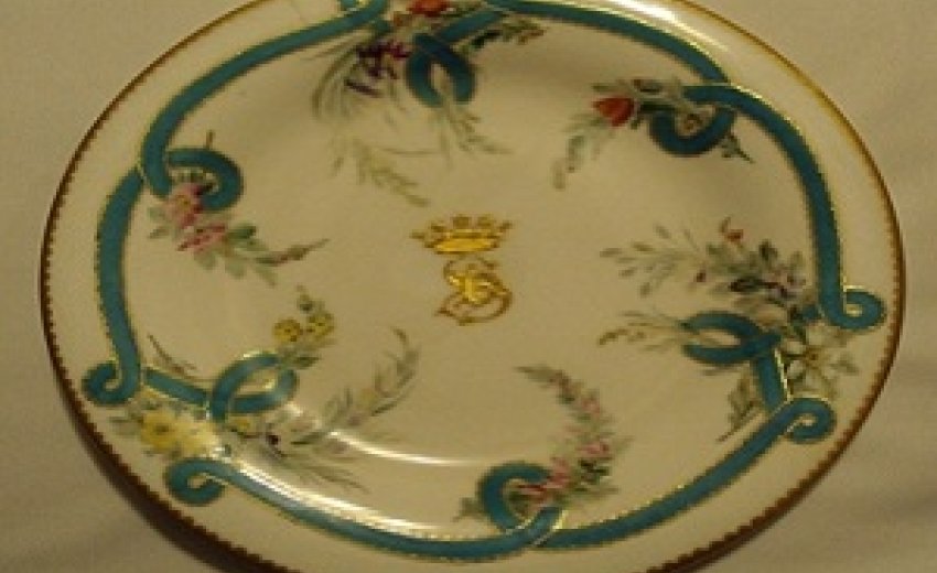 5. Punjab - Maharajah Duleep Singh - a dinner plate from the personal service of Maharajah Duleep Singh, made by Chamberlains (part of the Royal Worcester Porcelain Group). This superb example of British craftsmanship is considered one of the few (if any) pieces from the Royal Dinner Service produced by/for the Maharajah. The plate features the Royal cipher of the Maharajah in gold at the centre with the ornate decoration featuring floral motifs and a blue and gold ribbon effect. The rim of the plate is further embellished in gold.